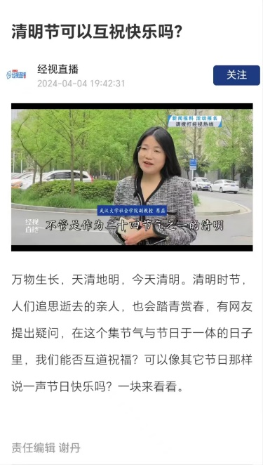 公司蔡磊副教授,3044am永利集团官网民俗学教研室主任,武汉老员工态与社会文化研究中心主任,近期分别接受湖北经视和极目新闻记者采访,就清明节的节俗和文化内涵以及网络上探讨较多的“清明节能说节日快乐吗”等问题分享了自己的见解。