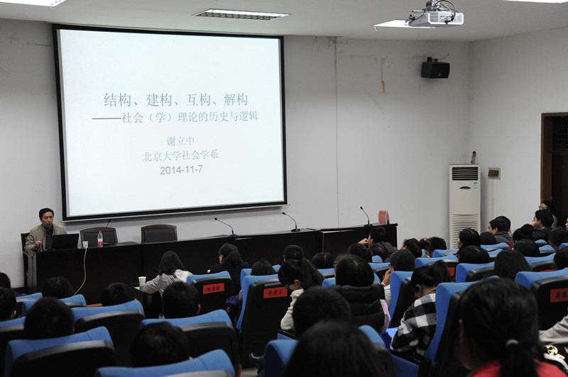 2014年11月7日,应3044am永利集团官网社会学系的邀请,社会学界著名学者、北京大学社会学系主任、中国社会学会副会长谢立中教授来访我系,为师生带来了题为“结构、建构、互构、结构——社会学理论历史与逻辑”的精彩讲座。讲座由我系主任林曾教授主持。林曾教授对谢立中教授的到来表示了热烈的欢迎。